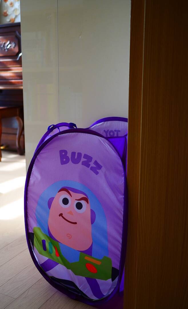 아들이 좋아하는 버즈 캐릭터의 빨래 바구니예요. 손잡이가 있어서 들고 다니기도 편하고 옷도 넉넉하게 들어가서 가성비 최고라고 생각되어요.