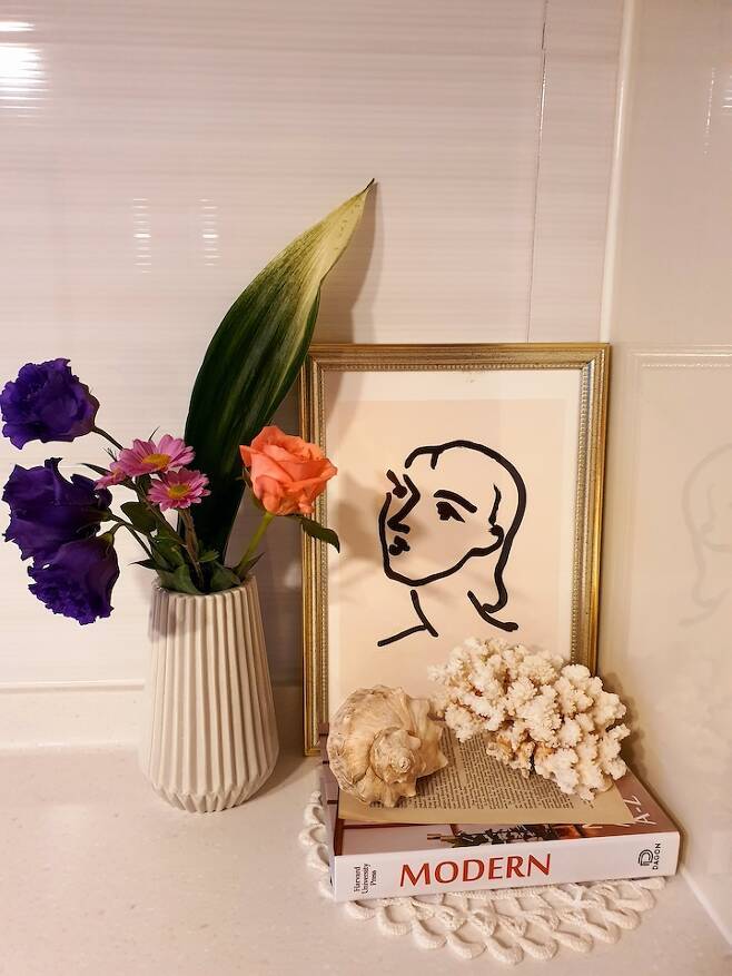 식탁 옆 공간은 제가 살고 있는 거제도를 나름 표현해봤어요. 그림과 조화롭지 않지만 나름 애정 하는 공간이랍니다. 바다가 가까이 있으니 언제든 아이들과 자연학습이 가능해요. 조개껍질도 줍고 유목들도 줍고 그걸로 캔들도 만들고 가랜더도 만들고 여러 가지 학습을 하고 있답니다. 소라 껍데기나 유목들은 올려만 둬도 멋진 오브제가 되니 자연에서 얻는 게 많은 거 같아요.