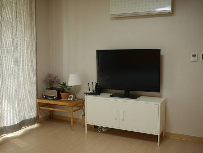 거실이 아닌 안방에 TV를 뒀어요. 선을 보이지 않게 정리하려고 안 쓰는 종이가방을 잘라서 넣을 수 있는 부분은 종이가방 안쪽으로 넣어뒀어요. 아예 안 보이진 않지만 그래도 가려지는 효과가 있어서 만족해요.