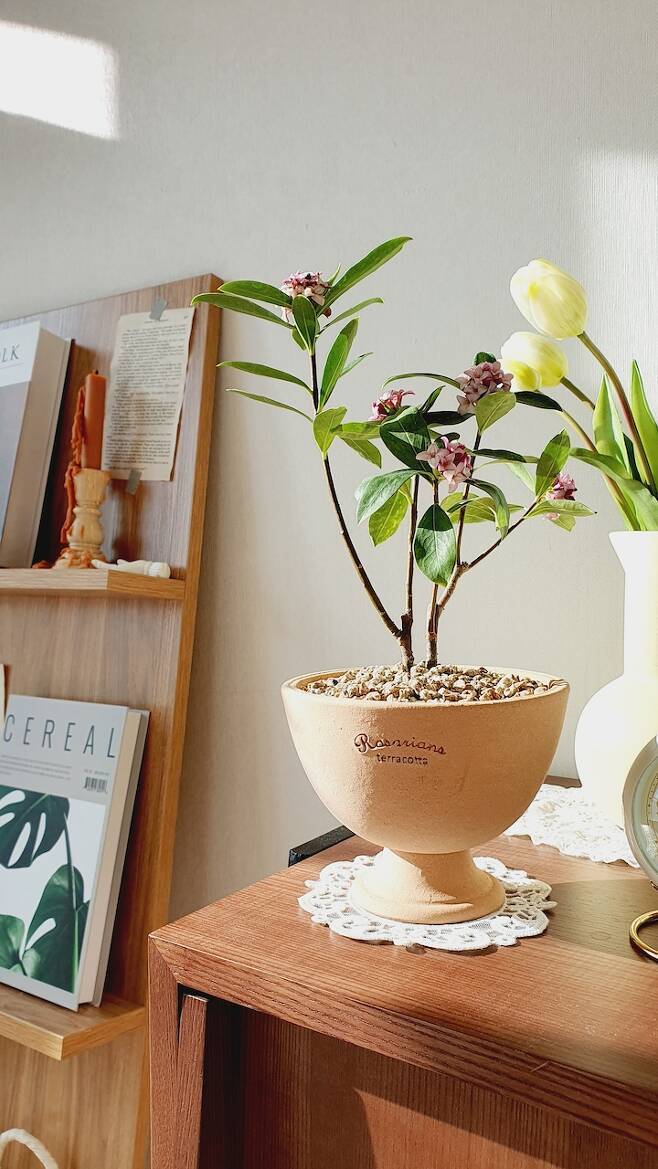 최근에 키우기 시작한 천리향인데 '꽃 향기가 천리까지 간다'고 천리향이래요. 그래서 온 집안에 꽃 향이 가득하고 좋아요. 집에서 키우려면 바람이 잘 통하는 베란다에서 키우는 걸 추천하시더라고요. 꽃 향기가 좀 사라질 때쯤 베란다로 가져다 둘 예정이에요.