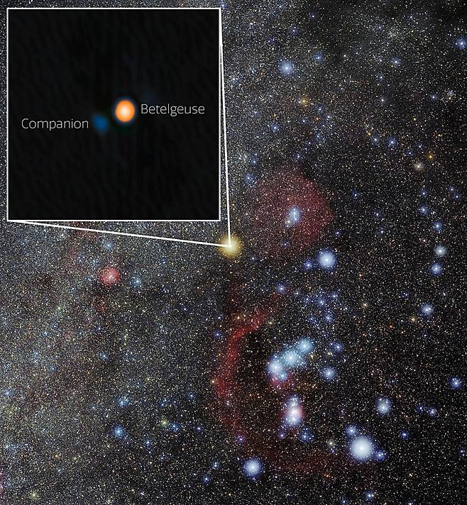 지구에서 약 724광년 떨어진 베텔기우스는 태양보다 대략 10만 배 밝아 밤하늘에서 가장 눈에 띄는 별 중 하나다. 800만 년 전 탄생해 이미 수명이 다한 베텔기우스는 2019~2020년 눈에 띄는 감광 현상으로 화제가 됐다. 이후 밝기를 되찾았지만 그 원인을 두고 동반성 가설이 힘을 받는 상황이다.