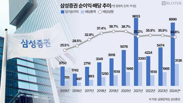 2일 금융투자 업계에 따르면 삼성증권은 지난해 결산 배당성향을 35% 수준으로 확정하기 위해 오는 3월 정기 주주총회 안건에 올릴 예정이다. 보통주 1주당 3500원씩 총 3126억원의 현금을 사용할 계획으로, 이를 위한 이사회 결의도 지난달 마쳤다.