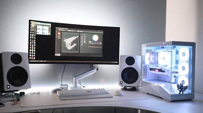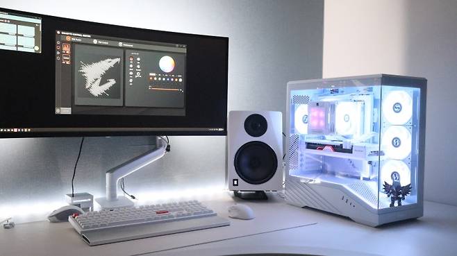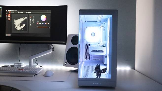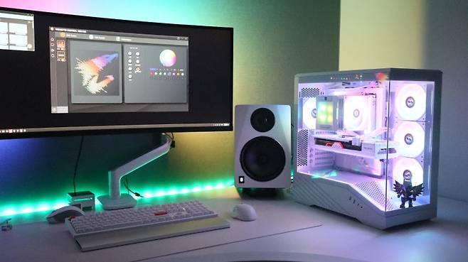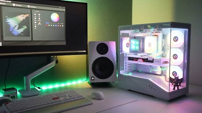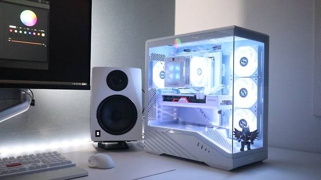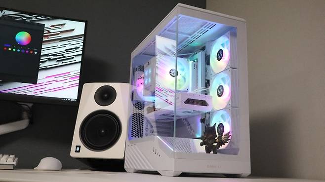 조립이 완료된 시스템의 모습입니다. ARGB가 많이 적용되어 있고 화이트 데스크테리어에 딱 맞는 제품이라 특히 이렇게 데스크 위에 올려두었을 때 매력적이네요.