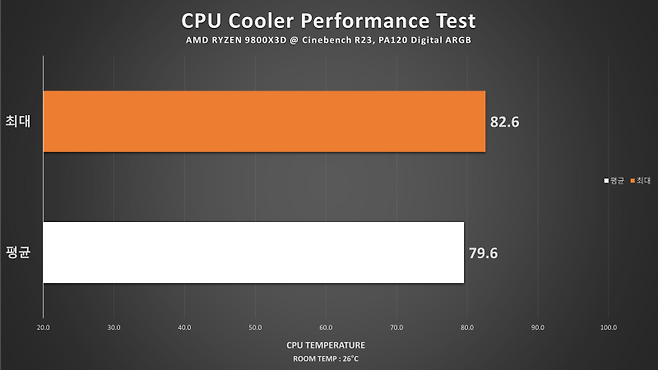 기본 장착된 쿨링팬과 써멀라이트의 대장급 공랭 쿨러를 활용해 간단한 온도 테스트를 진행해 봤습니다. 최상급의 게이밍&작업 CPU인 라이젠 9800X3D에 강력한 부하 조건을 걸어 두고 15분간 테스트를 진행했는데요.