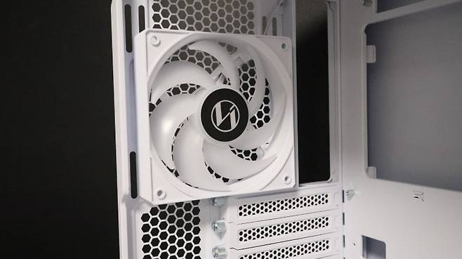 기본으로 장착된 쿨링팬도 흡기(리버스) 3개와 배기 1개로 충분한 구성입니다. 다만 케이블 정리 시 깔끔함을 더하는 그로멧이 모두 빠져있는 부분은 가격을 낮추기 위한 노력으로 보입니다.