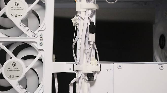 케이스를 슬림 하게 구성하다 보니 이 케이블 정리 공간이 여타 리안리의 형제들보다는 좁은 편입니다. 따라서 선 정리에 신경을 써서 꼼꼼하게 방향을 잡고 타이를 잘 활용해 주어야 측면 커버를 닫을 수 있습니다.