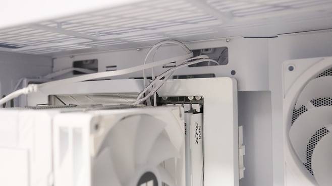 상단 공간은 여유가 많지 않기 때문에, 수랭 쿨러를 장착하는 경우엔 케이블 배선과 정리에 어려움이 예상되므로 케이블들을 먼저 보드와 연결한 후 라디에이터를 결합하는 방법을 권장합니다.