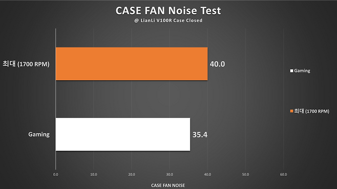 또한 강제로 기본 팬들을 최대 RPM으로 동작시킬 때도 너무 높지 않은 소음인 40dBA를 기록했으며, 일반적인 게이밍 환경(자동 제어 상태)에서는 쾌적한 소음 수준을 유지했습니다.