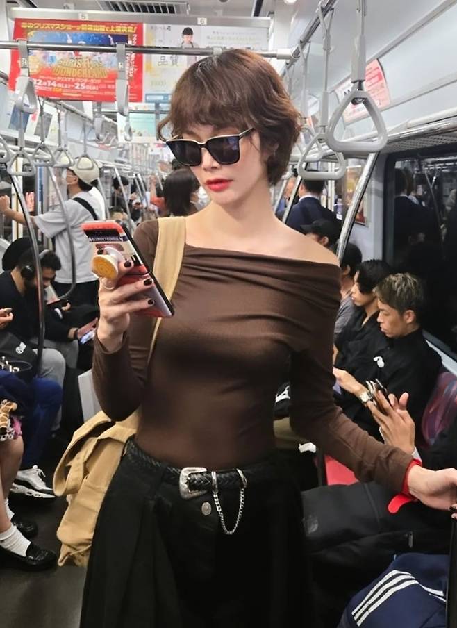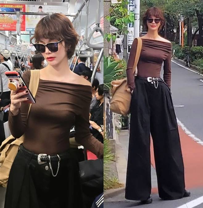 모델 송경아가 도쿄 지하철에서 헐렁한 팬츠의 개미허리로 마네킹 몸매를 과시했다.