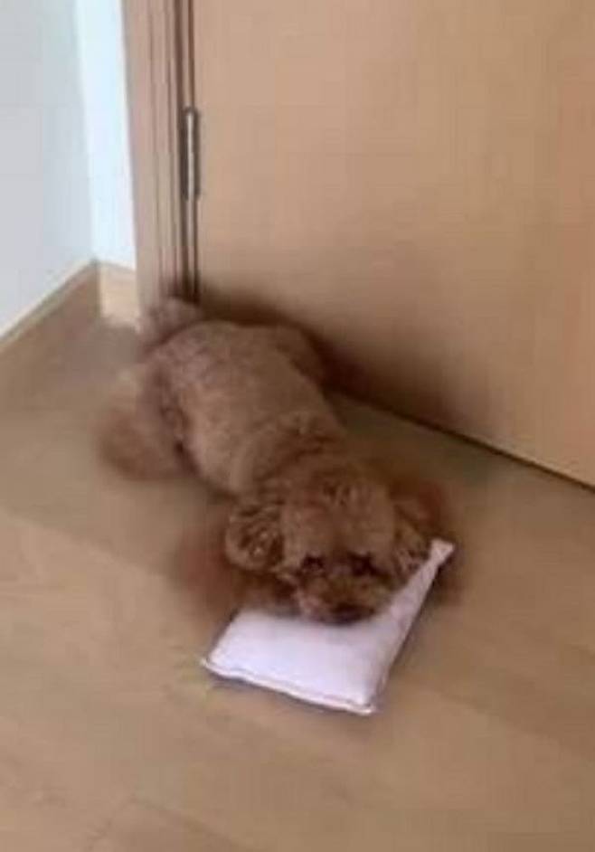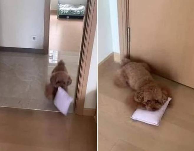 사실 강아지가 베개를 입에 물고 에어컨 작동 시킨 방안으로 달려간 것은 바닥에 베개를 깔고 자리잡고 눕기 위함이었는데요.