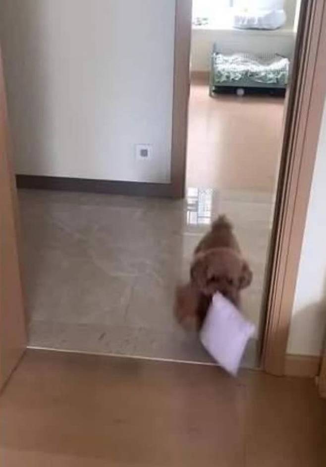무엇보다도 강아지가 입에 베개를 물고 달려온 것이 매우 인상적인데요. 그렇다면 왜 강아지는 베개를 물고 온 것인지 궁금합니다.