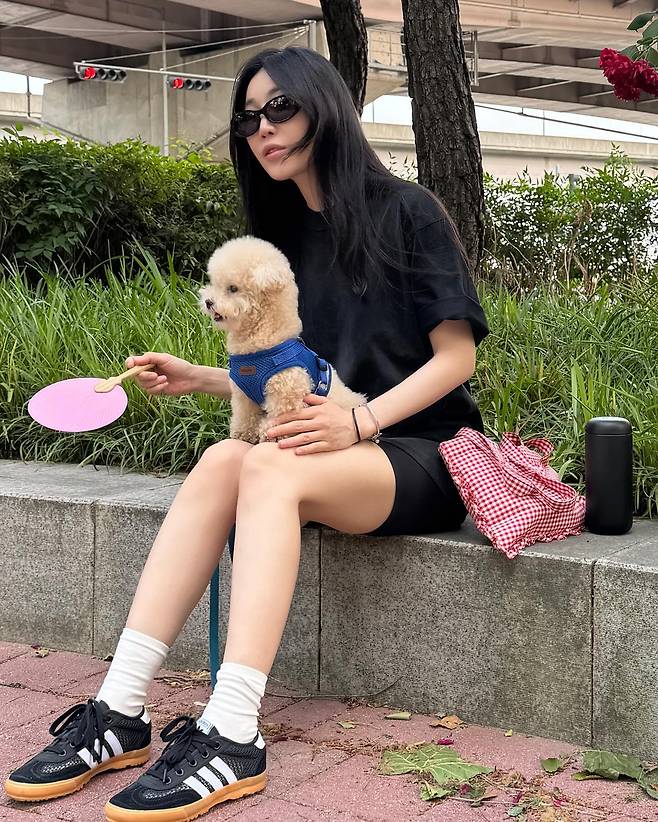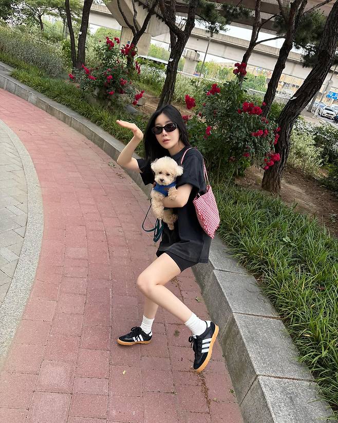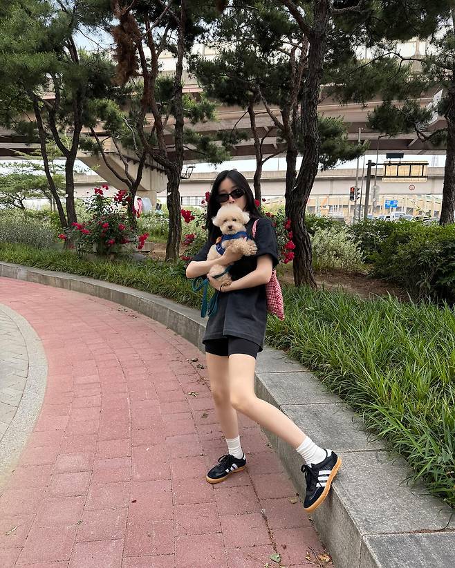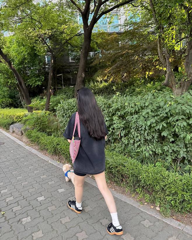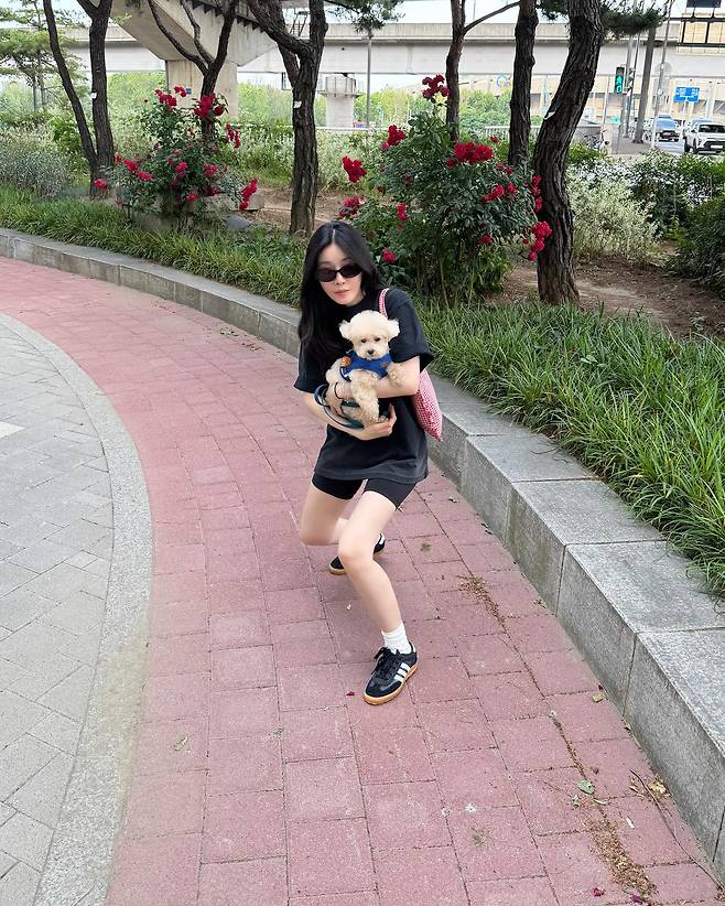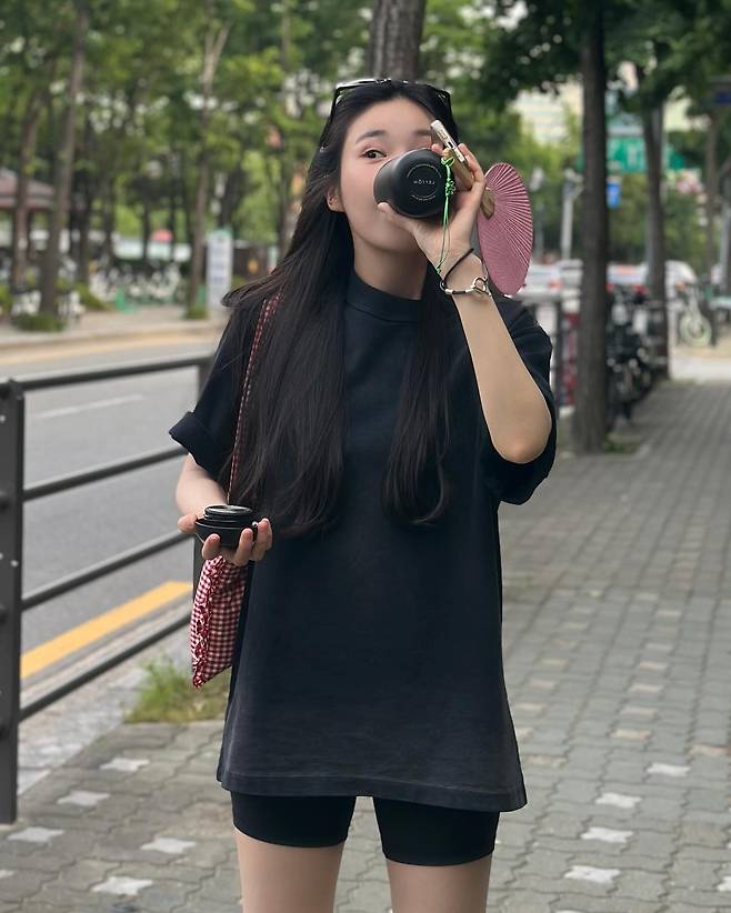 블랙 반팔에 바이커 팬츠 하나면 충분한 이해리의 산책룩