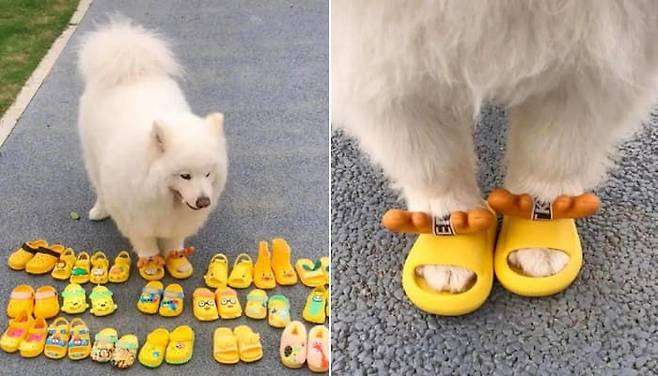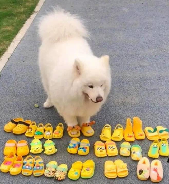 고민 끝에 집사는 사랑스러운 사모예드를 위한 특단의 조치를 내렸습니다! 바로 앙증맞은 노란색 미니 슈즈들을 대량 구매한 것이죠.