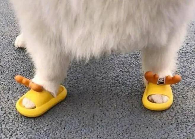 실제 착용샷을 보니 발에 착 감기는 완벽한 사이즈에 깜찍한 디자인까지! 노란색 신발을 신은 사모예드의 발은 보는 이들의 심장을 '심쿵'하게 만듭니다.