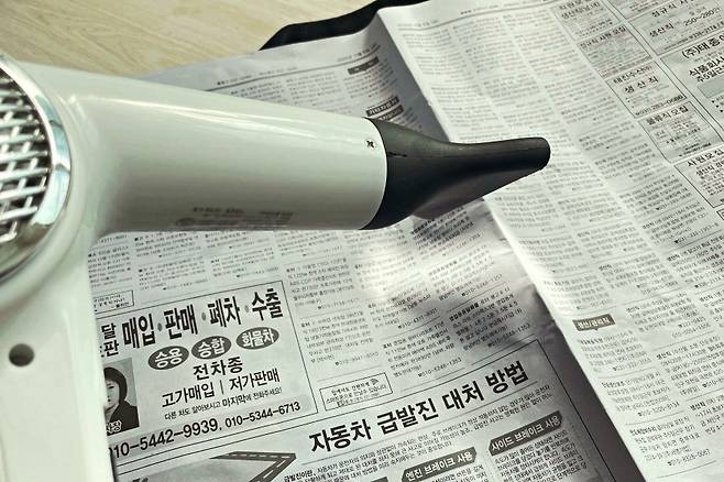그다음 헤어드라이기로 따뜻한 바람을 골고루 쐬어 주시면 되는데요. 이렇게 해주면 신문지로 냄새가 옮겨가 옷에서 나던 냄새가 사라진답니다.