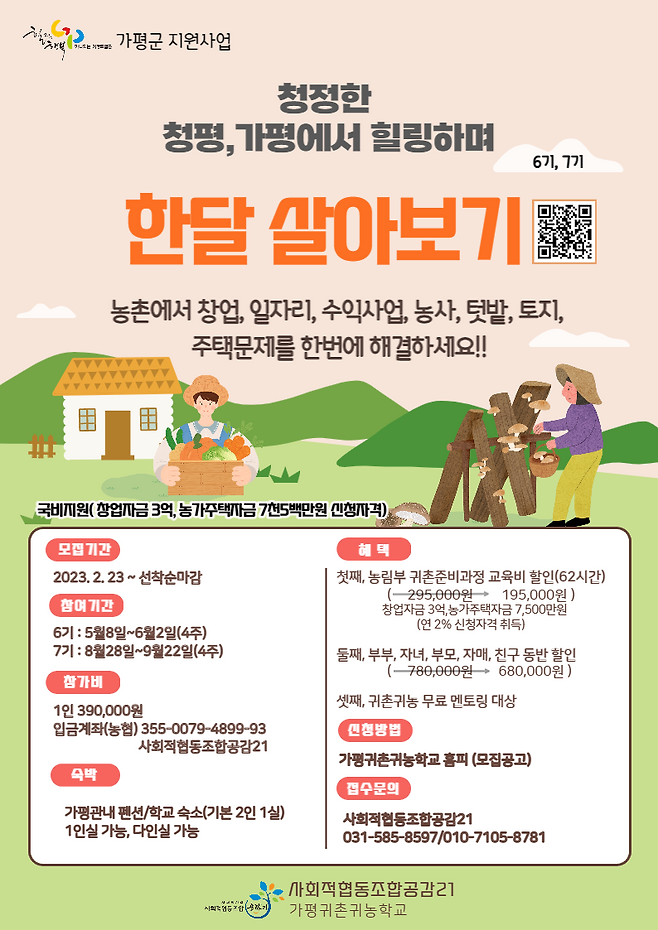 일례로, 경기도 가평군 소재의 한 사회적협동조합에서는 4주간 귀농귀촌학교를 실시하는데 지자체의 한달살기 지원사업에 선정되어 참가자들의 체험비, 체류비 등을 지원받고 있다. 참가자들은 4주간 가평관내에 있는 펜션이나 학교 숙소에 머물면서 귀농교육, 농장체험 등 다양한 과정을 섭렵한다. 비교적 적은 비용으로 농촌을 체험할 수 있는 기회라서 참가자들의 평가가 좋다. 이렇게 4주간 머물면서 생활하는데 필요한 개인 자부담은 1인당 39만원이다.