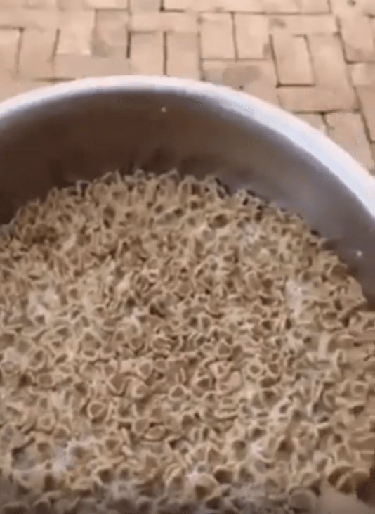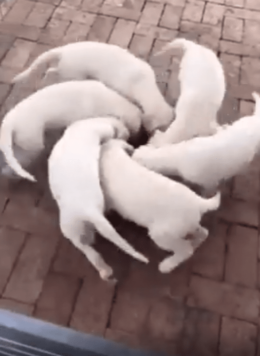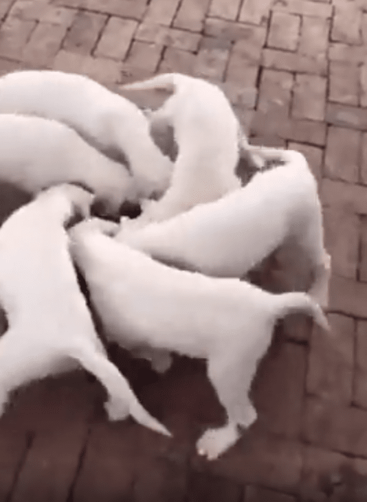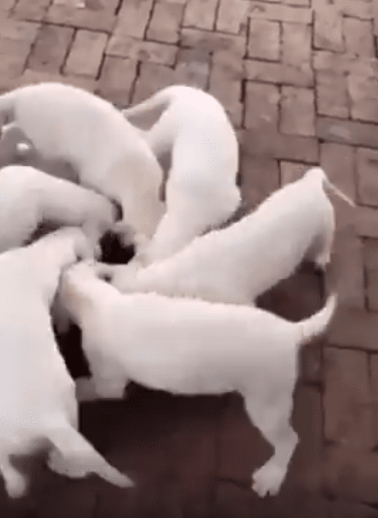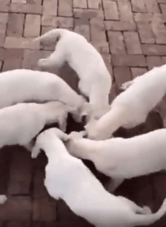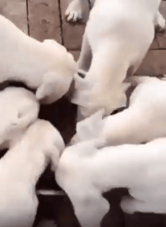 주인이 사료가 담긴 그릇을 바닥에 놓자 강아지들이 마치 기다렸다는 듯이 달려듭니다. 강아지들은 서로 부딪히며 그릇에 머리를 박고 빠르게 사료를 먹기 시작합니다. 몸이 그릇 주위를 빙글빙글 돌며 사료를 먹는 모습이 마치 태풍이 몰아치는 듯한 장면을 연상시킵니다. 그릇에 머리를 박고 먹는 강아지들의 열정이 보는 이마저도 놀라게 할 정도입니다.