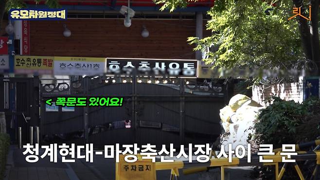 단지 가장 끝으로 왔는데 여기가 축산시장이랑 바로 붙어 있습니다. 저기가 지금 큰 문으로 막혀 있는데 왼쪽에 쪽문이 있거든요. 시장으로 가는 외부인들이 자꾸 단지를 통해서 가다 보니까 그거를 막으려고 문을 설치했다고 하더라고요.