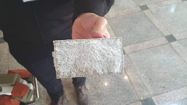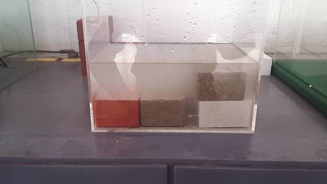 일반적으로 제대로 된 ALC블록인 경우 시멘트벽돌 대비 1/5, 속빈콘크리트블록 대비 1/4 수준으로 일반 건축자재에 비해 흡수율이 매우 낮다. 이를 증명하기 위해 이 대표는 직접 실험을 진행했다. 아래 사진은 적벽돌, 시멘트블록, ALC블록을 수조에 담갔다가 5분 후 꺼내 단면을 확인한 결과다. (ALC블록에는 물보다 낮은 비중에 의해 떠오르는 것을 방지하고자 시멘트블록을 올려두었다) 내부 전체가 흠뻑 젖은 적벽돌과 시멘트벽돌과는 다르게 ALC블록은 표면만 살짝 젖은 모습을 볼 수 있다.