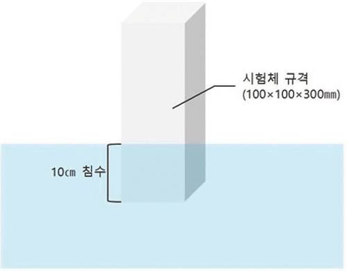 여기서 그치지 않고 5분 만에 이렇게 젖었다고 우려할 예비건축주들을 위해 물흡수 시험도 진행했다. 100×100×300 일반 ALC블록 시험체를 10cm를 침수시켜 2시간부터 21일까지 그 흡수량을 지켜본 결과는 아래 <표1>과 같다. 이렇듯 낮은 흡수율을 보이는 ALC블록은 일반제품보다 흡수율이 훨씬 낮은 방수제품으로 사용할 시 벽체의 첫 단이나 지하층, 화장실 벽체 등에도 훌륭하게 적용할 수 있다. 그렇지만 완전한 방수 자재가 아니므로 일반적으로 방수가 필요한 부분에 적용했다면 동일하게 방수공사는 진행해야하며 미적효과와 표면오염을 방지하기 위해서라도 마감 작업을 반드시 진행해야 한다.