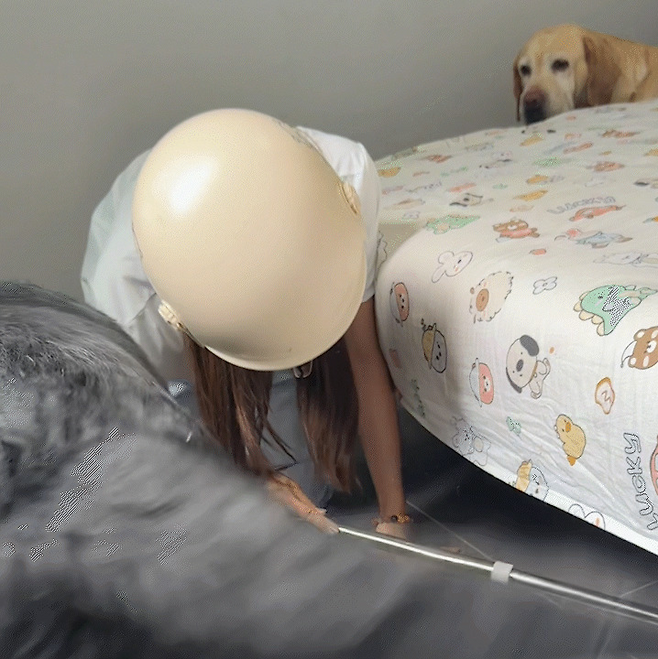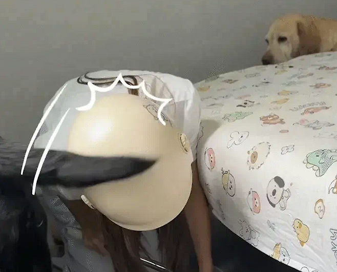 강아지가 몸을 돌리는 순간, 힘차게 흔들리던 대형견의 꼬리가 원심력을 이기지 못하고 그대로 주인의 머리를 강타한 것입니다. '퍽!' 하는 둔탁한 소리가 방안을 울렸고, 그 소리는 주변 사람들마저 깜짝 놀라게 할 만큼 컸습니다. 다행히 여성은 미리 쓰고 있던 헬멧 덕분에 아무런 상처도 입지 않았습니다.