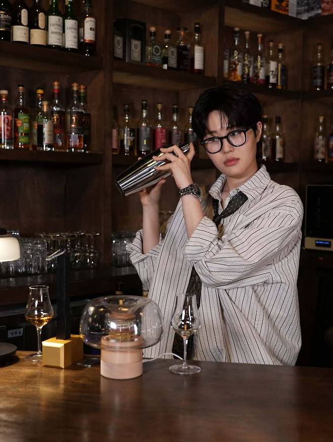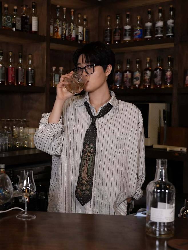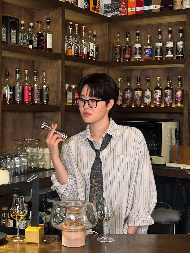 최근 엄지윤은 바(bar)를 배경으로 한 다양한 사진에서 자신만의 독특한 남장 스타일을 보여줬다. 그의 스타일 중심에는 오버핏 스트라이프 셔츠와 넉넉한 핏의 와이드 팬츠가 있다.