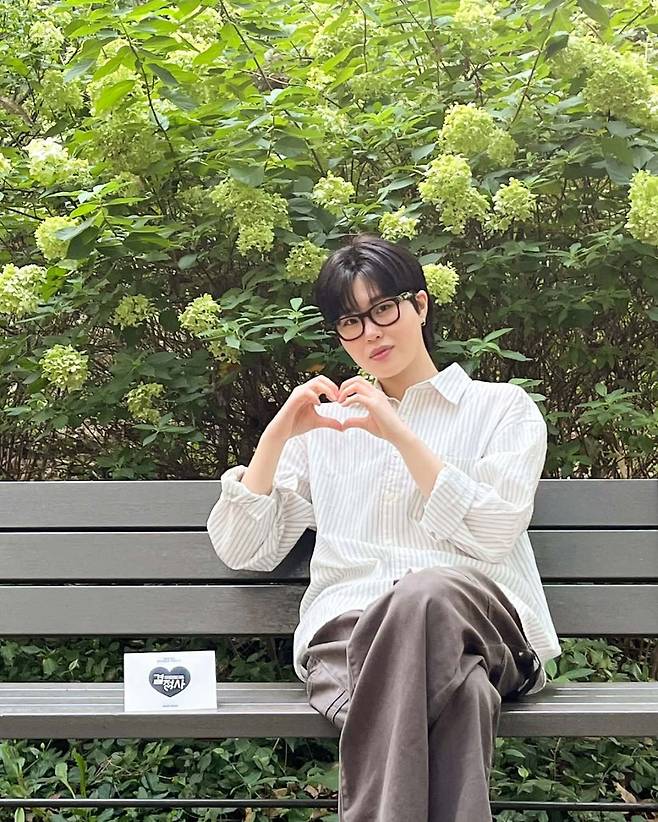 특히, 두꺼운 검은 뿔테 안경은 지적인 이미지를 더하고 손목에는 메탈 밴드 시계를 착용해 클래식한 포인트를 더했다. 벤치에 앉은 사진에서는 다크 브라운 컬러의 와이드 팬츠가 전체적으로 루즈한 실루엣을 만들어 상의와 조화를 이뤘다.
