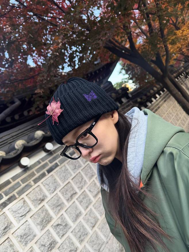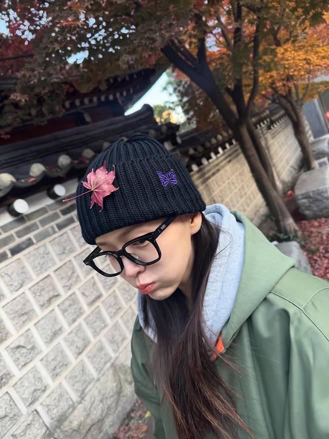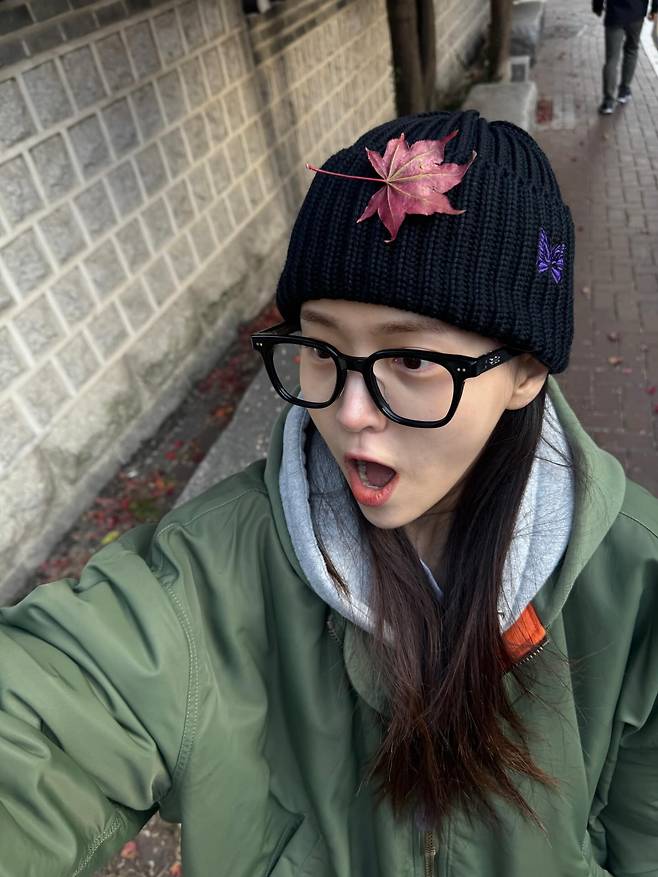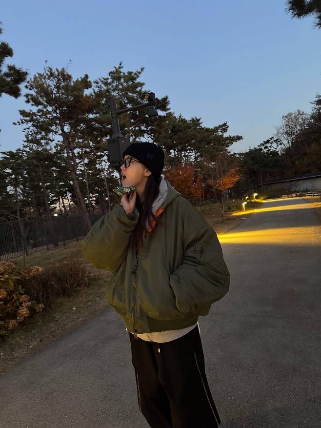 사진 속 김지은은 나무들이 늘어선 고즈넉한 길 위에서 블랙 비니와 안경을 착용하고 나른한 표정을 지으며 여유로운 일상을 만끽하고 있는데요.