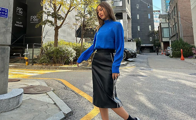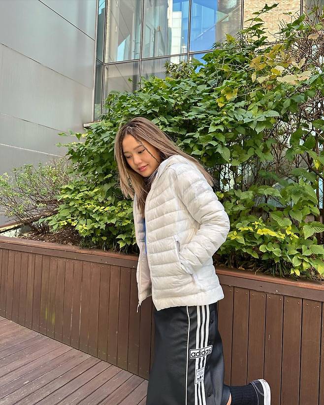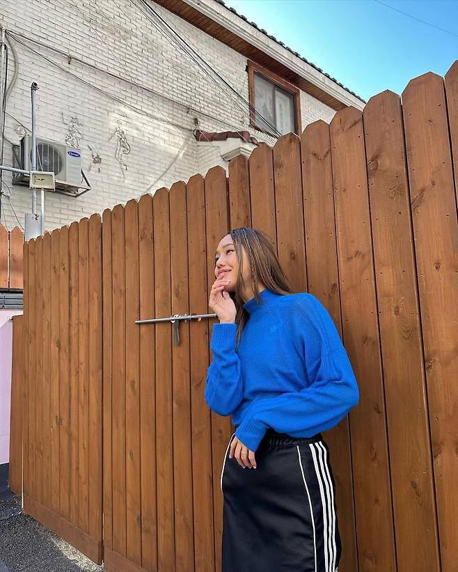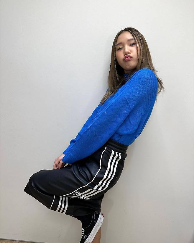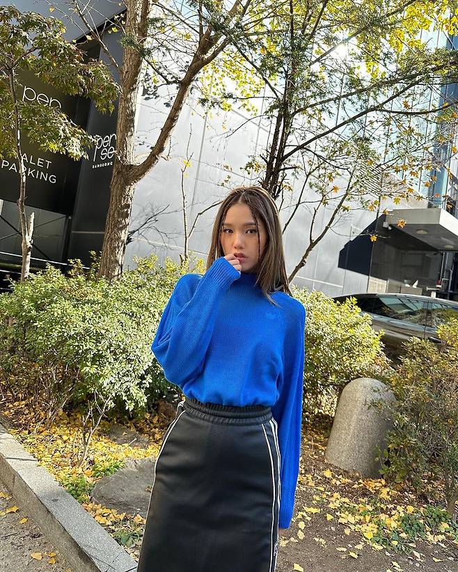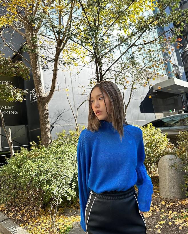 공개된 사진에서 미미는 목을 감싸는 블루 니트와 양쪽에 줄이 있는 블랙 스커트와 블랙 스니커즈를 신었다. 또한 아이보리 경량패딩과 백을 메고 산뜻한 미소를 짓고 있다.