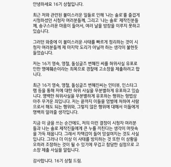 SBS Plus·ENA '나는 솔로(나는 SOLO)' 16기 출연자 상철은 21일 "문제의 소지가 되는 악플은 보존 처리 될 것입니다"라는 글과 함께 장문의 글이 담긴 입장문을 업로드했다.