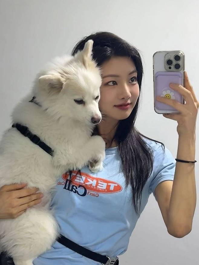 두 번째 착장은 반려견과 함께한 셀피에서 볼 수 있는 청량한 티셔츠 룩이다. 연하늘색 티셔츠에 레드 프린트가 들어간 텍스트 로고가 돋보이며, 슬림한 핏이 그녀의 건강하고 날씬한 체형을 강조한다. 티셔츠에 블랙 벨트를 매치해 실루엣에 변화를 주며 캐주얼하면서도 정돈된 느낌을 살렸다.