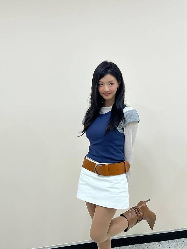 첫 번째 스타일은 프레피 무드가 느껴지는 미니스커트 룩이다. 화이트 미니스커트에 브라운 벨트로 허리를 강조했고, 블루 톤의 슬리브리스 티셔츠에 그레이 반팔과 시스루 이너를 레이어드해 독특한 실루엣을 연출했다. 여기에 브라운 앵클 부츠로 톤온톤 매치를 완성하며 세련된 감성을 더했다. 시크한 듯 러블리한 표정도 스타일을 배가시킨 포인트다.