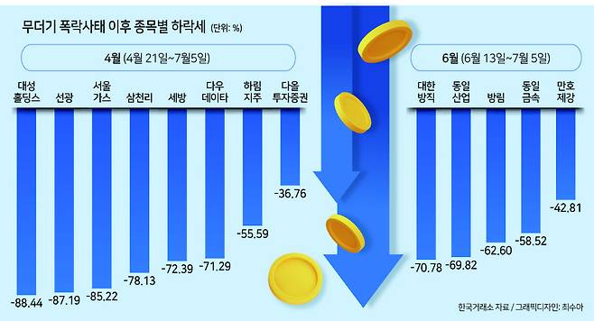 개인들이 ‘하따’에 나서며 매수를 이어가고 있지만 전문가들은 추가 하락 여지가 있는 만큼 투자에 주의해야 한다고 경고하고 있다. 상당수 종목들이 여전히 주가 회복에도 고전을 겪고 있다. 하한가 사태 발생 대비 하락세를 살펴보면 ▷4월 대성홀딩스(-88%), 선광(-87%), 삼천리(-78%) 등 ▷6월 대한방직(-71%), 동일산업(-70%), 방림(-63%) 등의 순으로 집계됐다. 유혜림 기자