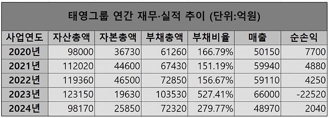 태영건설의 위기 전인 2020~2022년 태영그룹 부채비율은 평균 150~160%대로 안정적 범위 내였다. 태영건설이 부도 위기에 처한 2023년은 2조2520억원에 달하는 순손실이 발생하는 등 재무가 악화했으며 부채비율은 527.41%까지 치솟았다. 워크아웃 자구안으로 유동성을 확보해 차입금을 상환함에 따라 부채총액은 2023년 말 10조3530억원에서 2024년 말 7조2320억원으로 3조1210억원 감소했다. 같은 기간 부채비율은 527.41%에서 279.77%로 247.34%p 개선됐다.