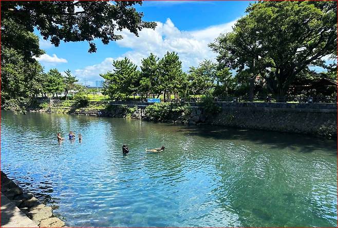 월대천은 한라산 자락에서 흘러내린 계곡수가 제주시 외도동을 지나 바다로 유입되는 하천입니다. '외도천'이라 불리기도 하며, 제주시가 선정한 '숨은 비경 31선' 중 하나로, 아름다운 자연풍경과 접근성까지 갖춘 여름철 물놀이 명소입니다. 무엇보다도 이곳은 한적한 동네 안에 있으면서도, 제주공항에서는 차로 약 15분밖에 걸리지 않아 도심형 피서지로 손색이 없습니다. 마치 계곡에서 노는 듯한 청량함과 바닷가의 탁 트인 분위기가 공존해, 제주에서만 가능한 독특한 풍경을 자랑합니다.