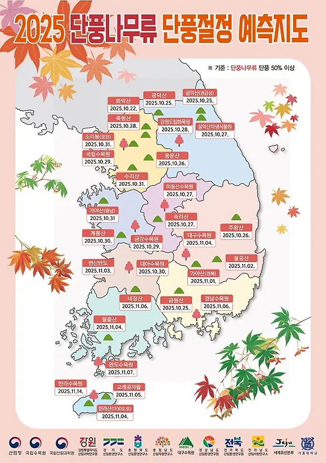 올해 단풍 소식은 평소보다 한 박자 늦게 들려온다. 산림청은 10월 1일, 국립수목원과 국립산림과학원의 협력으로 제작한 ‘2025년 산림단풍 예측지도’를 공개했다. 지도에 따르면 전국 주요 산림의 단풍 절정 시기는 10월 하순부터 11월 초 사이로 예측됐다.