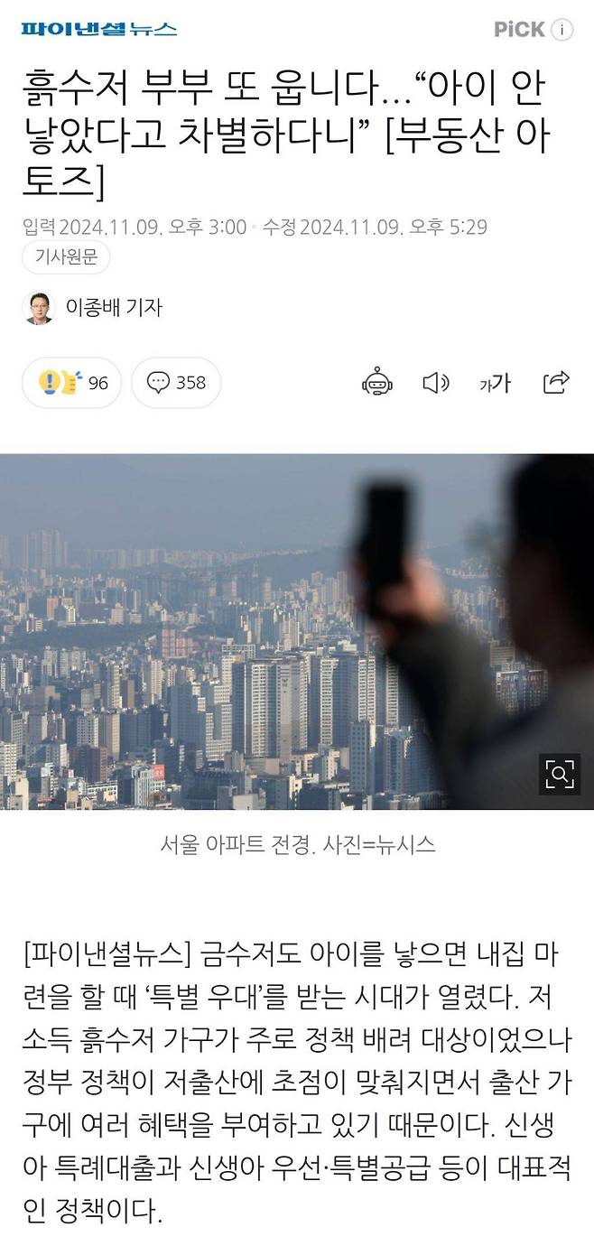 금수저도 아이를 낳으면 내집 마련을 할 때 ‘특별 우대’를 받는 시대가 열렸다. 저소득 흙수저 가구가 주로 정책 배려 대상이었으나 정부 정책이 저출산에 초점이 맞춰지면서 출산 가구에 여