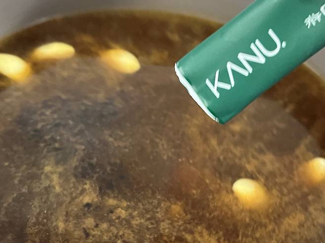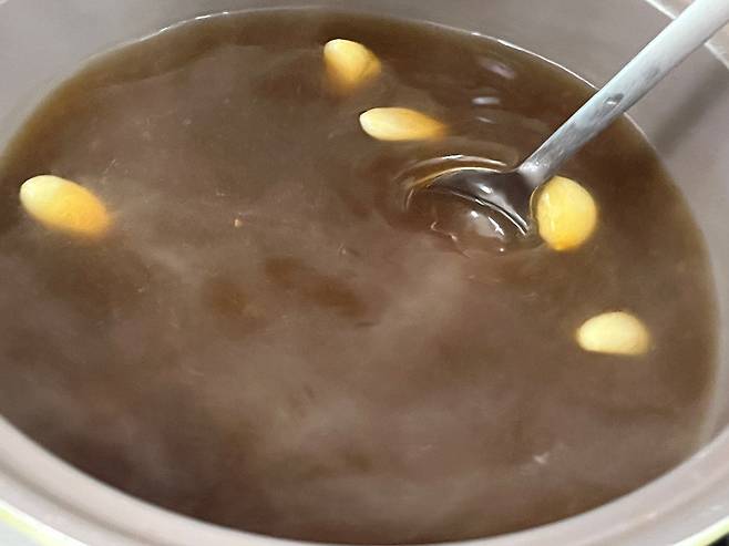 고기가 충분히 잠길 만큼의 물을 냄비에 받아서 끓이세요. 마늘 10알 넣고 된장은 1스푼 수북하게 떠서 풀어 줍니다. 된장을 넣으면 특유의 구수한 풍미가 배어들어 고기 맛이 깊고 진해집니다.