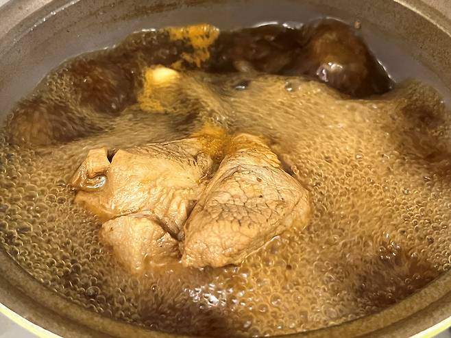 고기를 넣고 뚜껑을 열어 센 불로 끓이세요. 고기는 부위를 정하는 것도 중요한데요. 지방이 어느 정도 있어야 부드럽고 촉촉한 맛이 납니다.