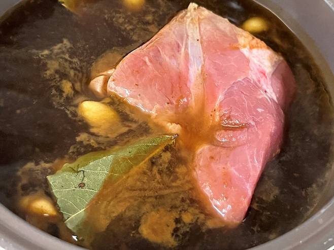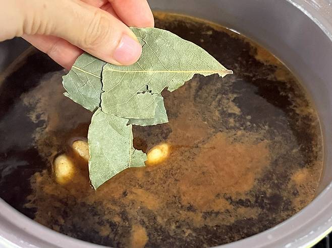 월계수잎도 있으시다면 4~5장 넣어 주세요. 만일 없다면 생략 가능합니다. 월계수잎 대신 대파, 생강 등을 넣어도 잡내 제거 효과가 있습니다.