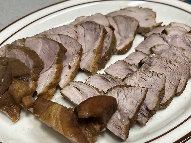 뜸 들이기까지 끝난 후 고기를 꺼내서 먹기 좋게 잘라 보세요. 오랫동안 푹 삶았더니 부드럽고 촉촉해서 쉽게 썰립니다.