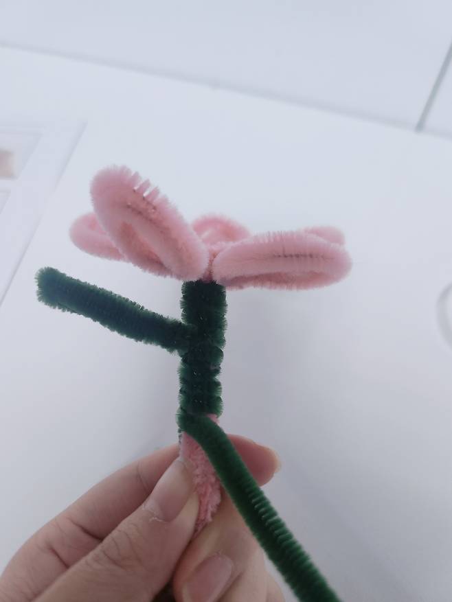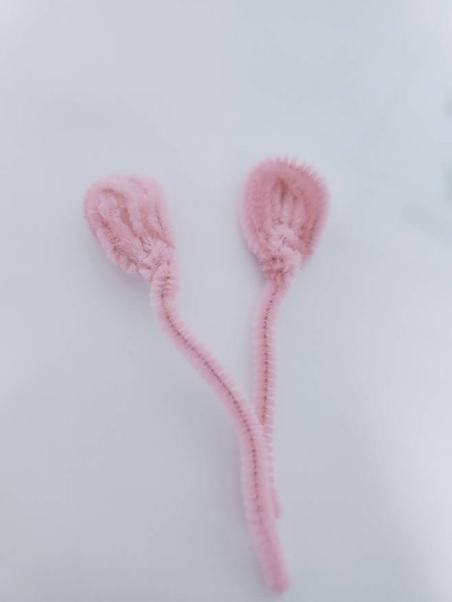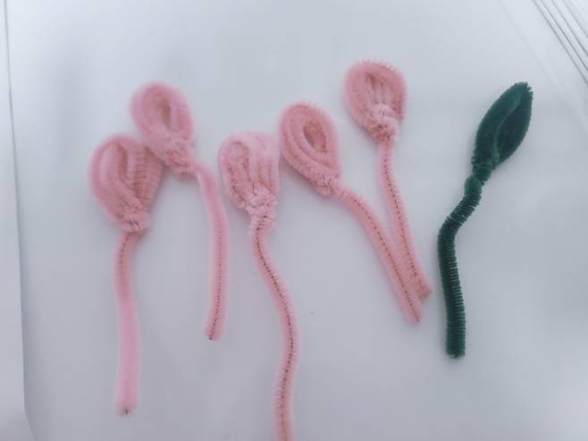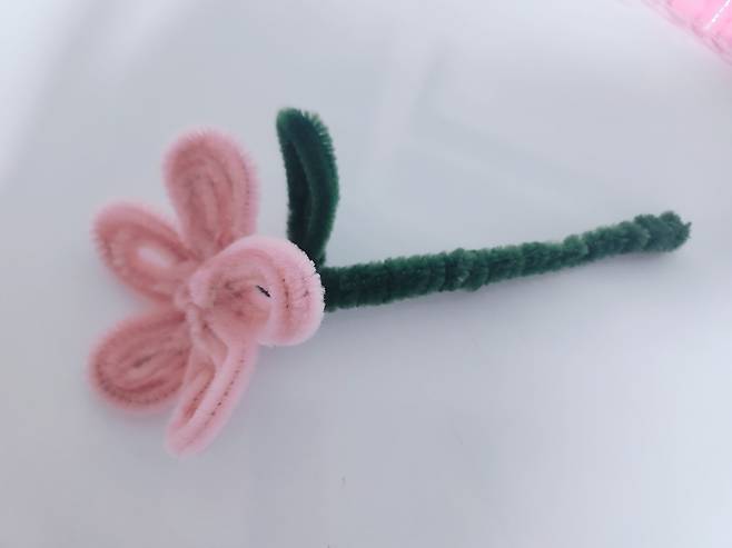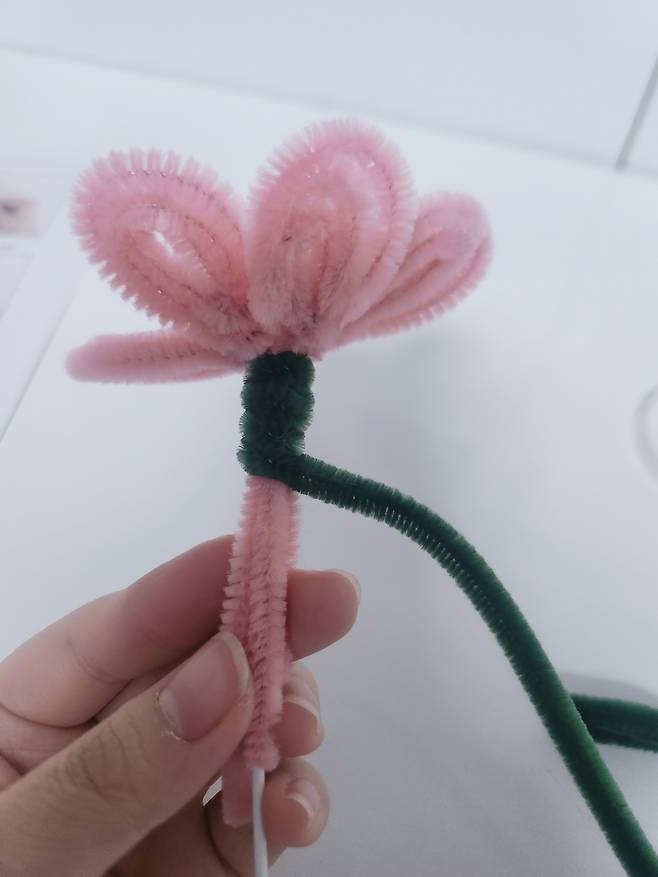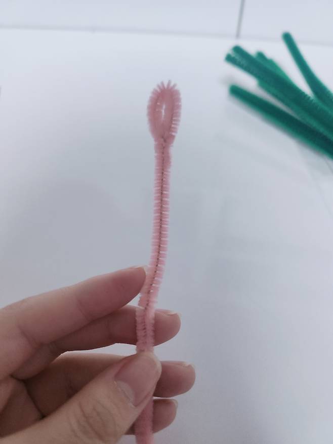 먼저 꽃잎을 만들어 줄건데요. 분홍색 모루를 손가락 한마디 사이즈로 접어 꼬아주었어요.