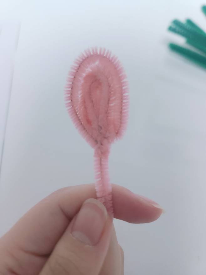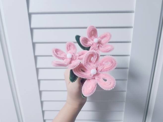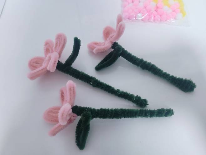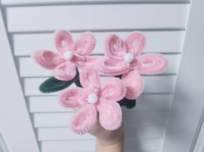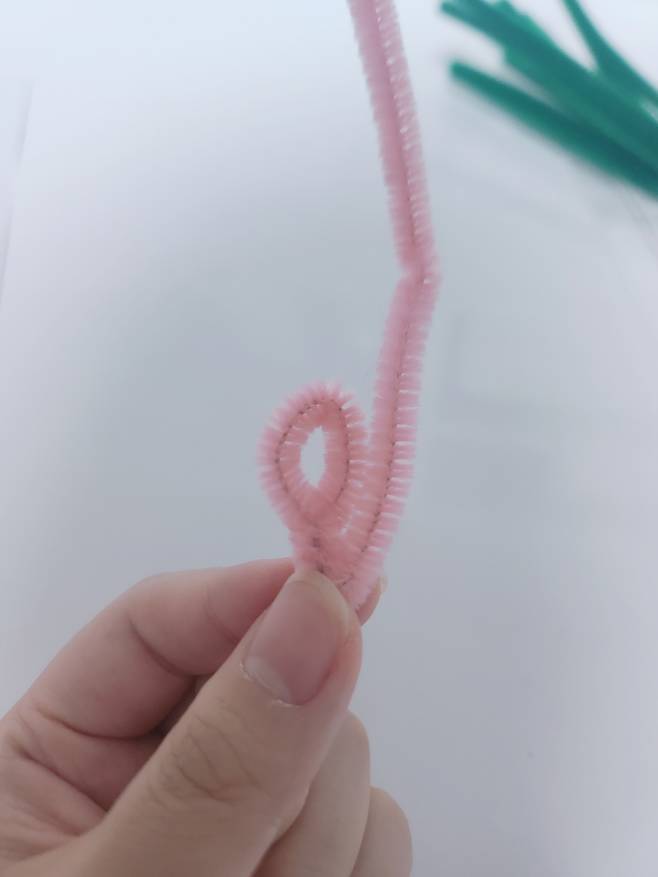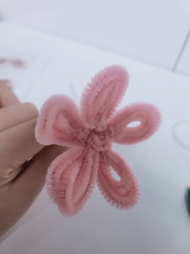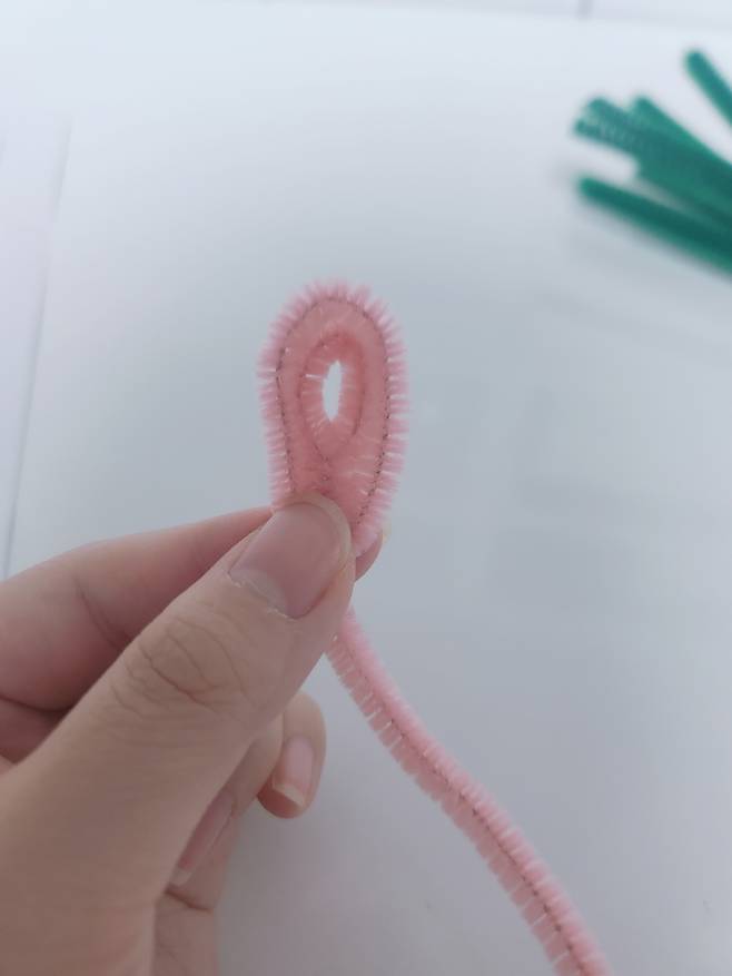 먼저 꽃잎을 만들어 줄건데요. 분홍색 모루를 손가락 한마디 사이즈로 접어 꼬아주었어요.