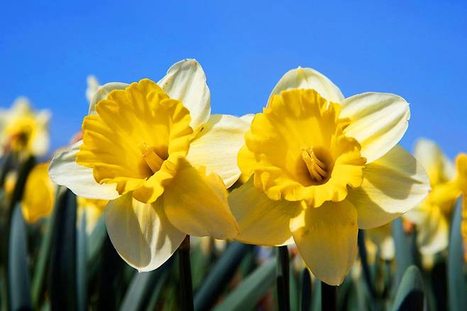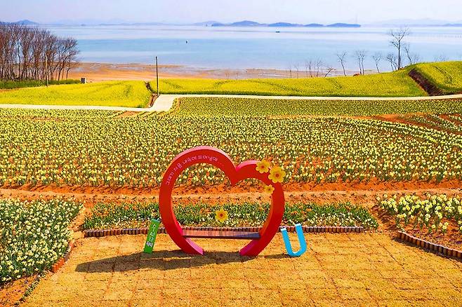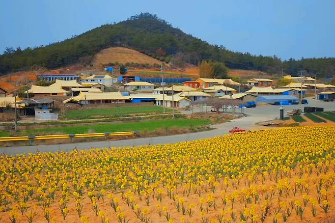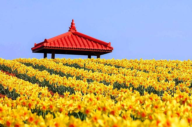 지붕도, 가로등도, 심지어 정류장까지 모두 노란색으로 꾸며져 있어 마치 동화 속 마을에 들어온 듯한 느낌을 줍니다. 그리고 그 중심에는 13.4ha 규모의 드넓은 수선화밭이 있습니다.