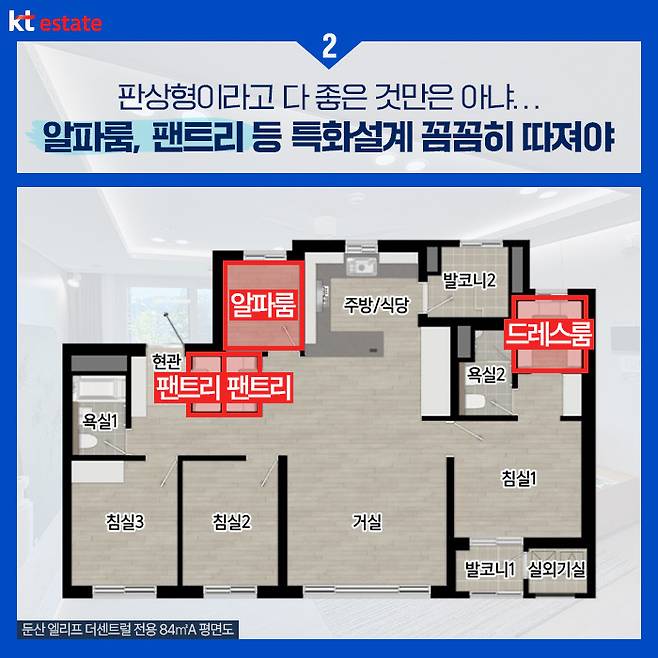 하지만, 같은 판상형이라도 팬트리나 알파룸 등 특화 공간을 제공하는 아파트가 있는 반면, 그냥 침실로만 구성되는 곳도 있는데요. 당연히 특화 공간을 제공하는 곳일수록 그렇지 않은 곳보다 삶의 질이 올라가며, 이는 곧 앞으로의 미래가치로 연결됩니다.