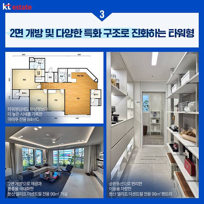 이를 봤을 땐 타워형도 타워형 나름대로 뛰어난 특화구조만 갖춘다면 판상형 만큼이나 미래가치가 높다고 볼 수 있는데요. 일례로 둔산 엘리프 더센트럴 전용 99㎡의 경우에도 타워형이지만, 거실의 두 면에 통창을 단 2면 개방 구조로 통기성과 채광성을 높인 부분이 장점으로 부각됐습니다.