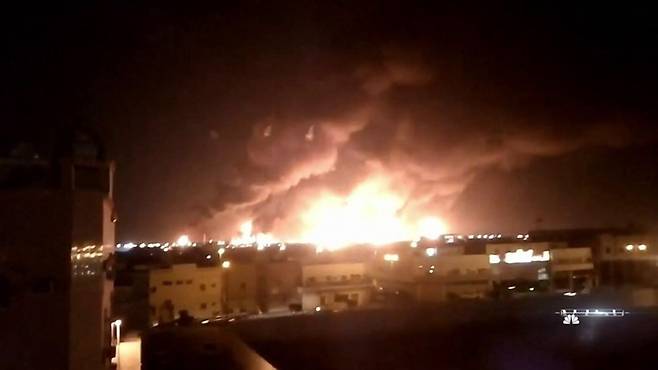 사우디아라비아의 리야드 상공을 가로지르는 미사일 한 발. 이는 2019년 사우디 아람코 석유시설 공격 당시 후티 반군이 발사한, 사우디 방공망을 뚫은 미사일이었습니다.