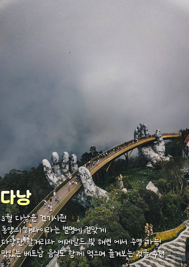 건기 시즌의 3월 다낭은 “동양의 하와이”라는 별명에 걸맞게, 맑고 쾌적한 날씨 속에서 여행의 매력을 한껏 느낄 수 있는 최적의 시기입니다. 또한, 저렴한 항공권과 물가 덕분에 가성비 좋은 해외 여행지로 손꼽히며, 예산을 아끼면서도 풍성한 경험을 쌓을 수 있다는 것이 장점이죠.