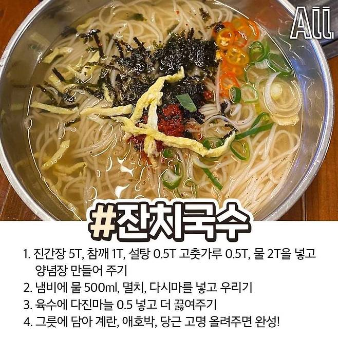 재료: 소면, 멸치 또는 다시마 육수, 국간장, 진간장, 다진 마늘, 대파간단한 방법: