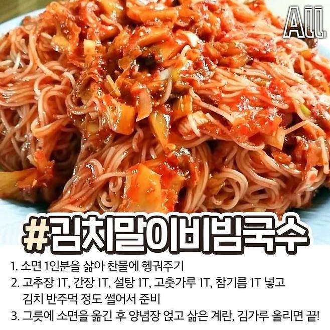 재료: 삶은 소면, 고추장, 식초, 설탕, 간장, 참기름, 오이, 김치간단한 방법: